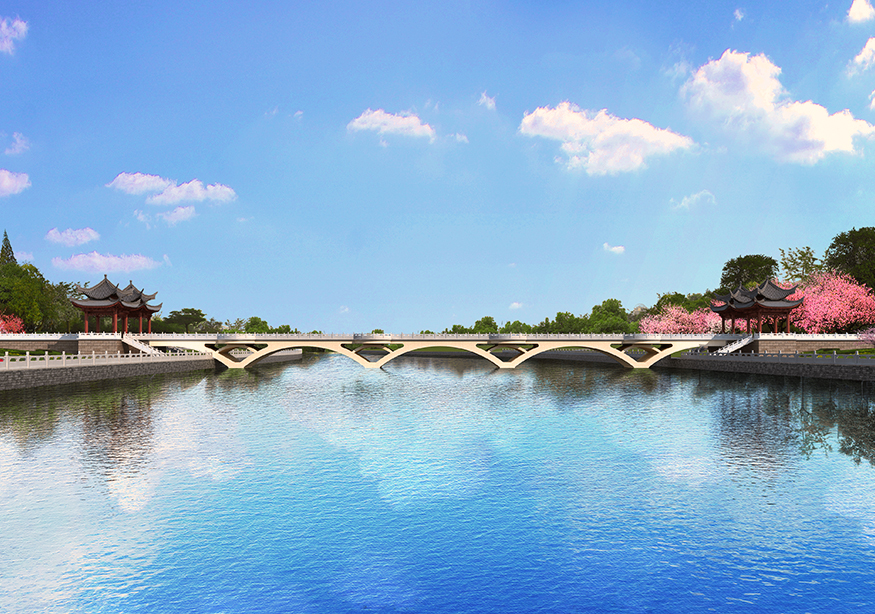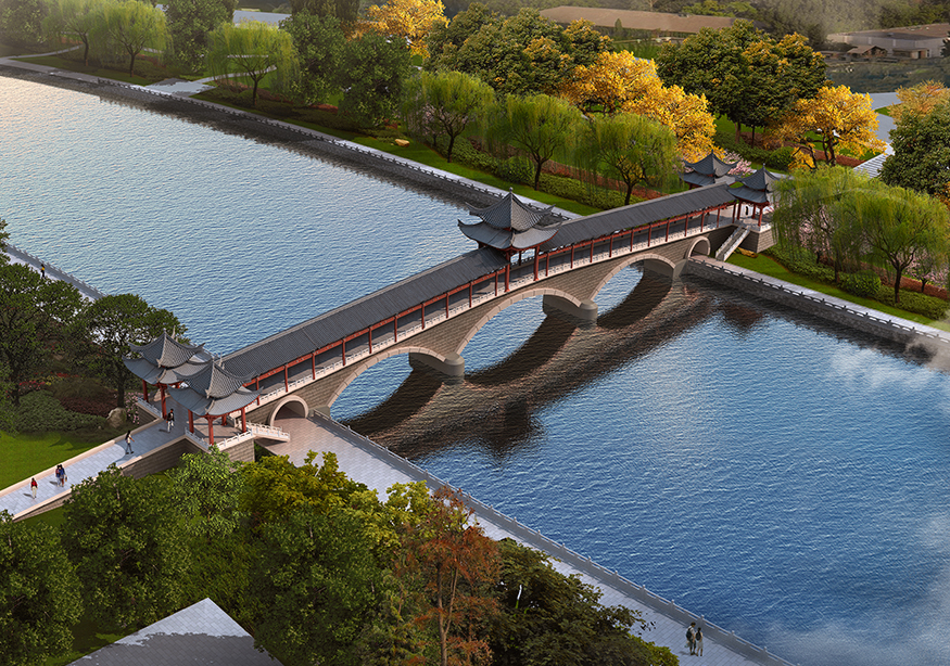 橋上亭廊形式采用江南園林風格形式,配合下部的景觀仿石拱橋,典型的江南水鄉(xiāng)風格;為體現(xiàn)當?shù)孛晒抛宓奶攸c,可在橋梁欄桿欄板側面及亭廊頂?shù)南虏康窨?、繪制一些能夠體現(xiàn)蒙古族文化特點的圖案,如騎射、摔跤等。江南文化與蒙古文化在橋上的相互融合統(tǒng)一,充分體現(xiàn)了援建的友誼。