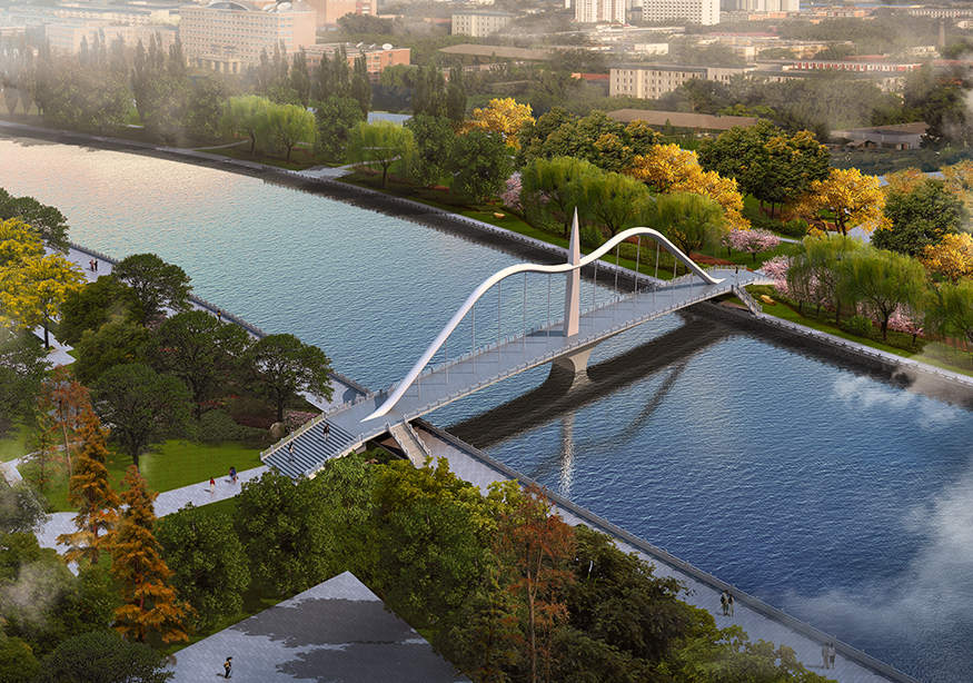 同方案一在橋梁兩頭設置四座江南園林風格的涼亭,橋上未設置亭廊,考慮到平面韻律的變化,在橋墩位置平面懸挑加大,形成觀景平臺,兼顧景觀與實用的功能結合。同方案一蒙古族的文化特點可以在欄桿及涼亭上體現(xiàn)。
