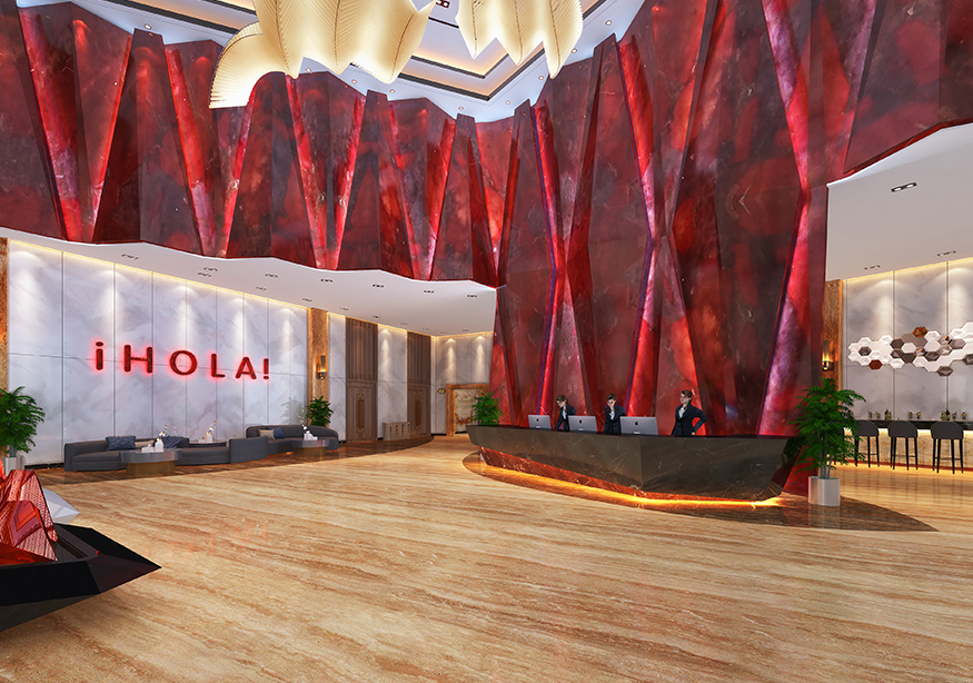 酒店大堂7.5米的挑空設(shè)計映入眼簾。酒店大堂面積近1000平方米,內(nèi)部裝修風(fēng)格融入了西方的巴塞羅元素,